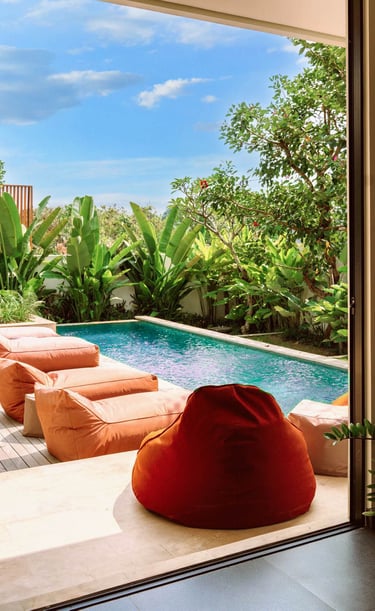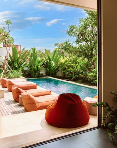 Step outside to the expansive garden and discover our crystal clear, turquoise swimming pool surrounded by tropical plants, offering a refreshing escape under the Bali sun. Relax on the sun beds, enjoy a book in the shaded area, or take in the mesmerising sunset views.